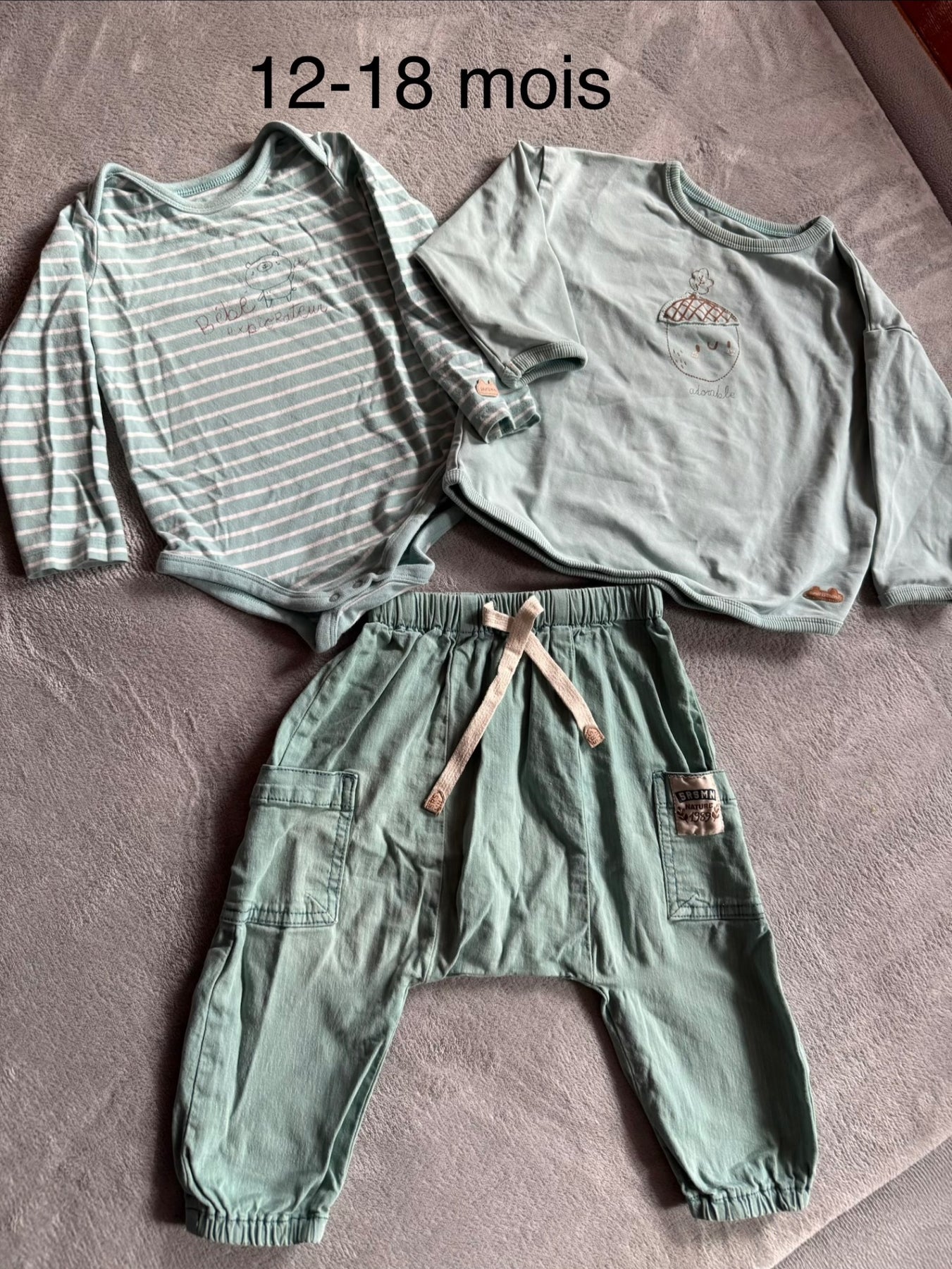 Ensemble 12-18 mois porté par 1 enfant. Très mignon. Ample pour les mouvements. Aucune tache ni trou. Très bonne condition. Maison sans fumée.