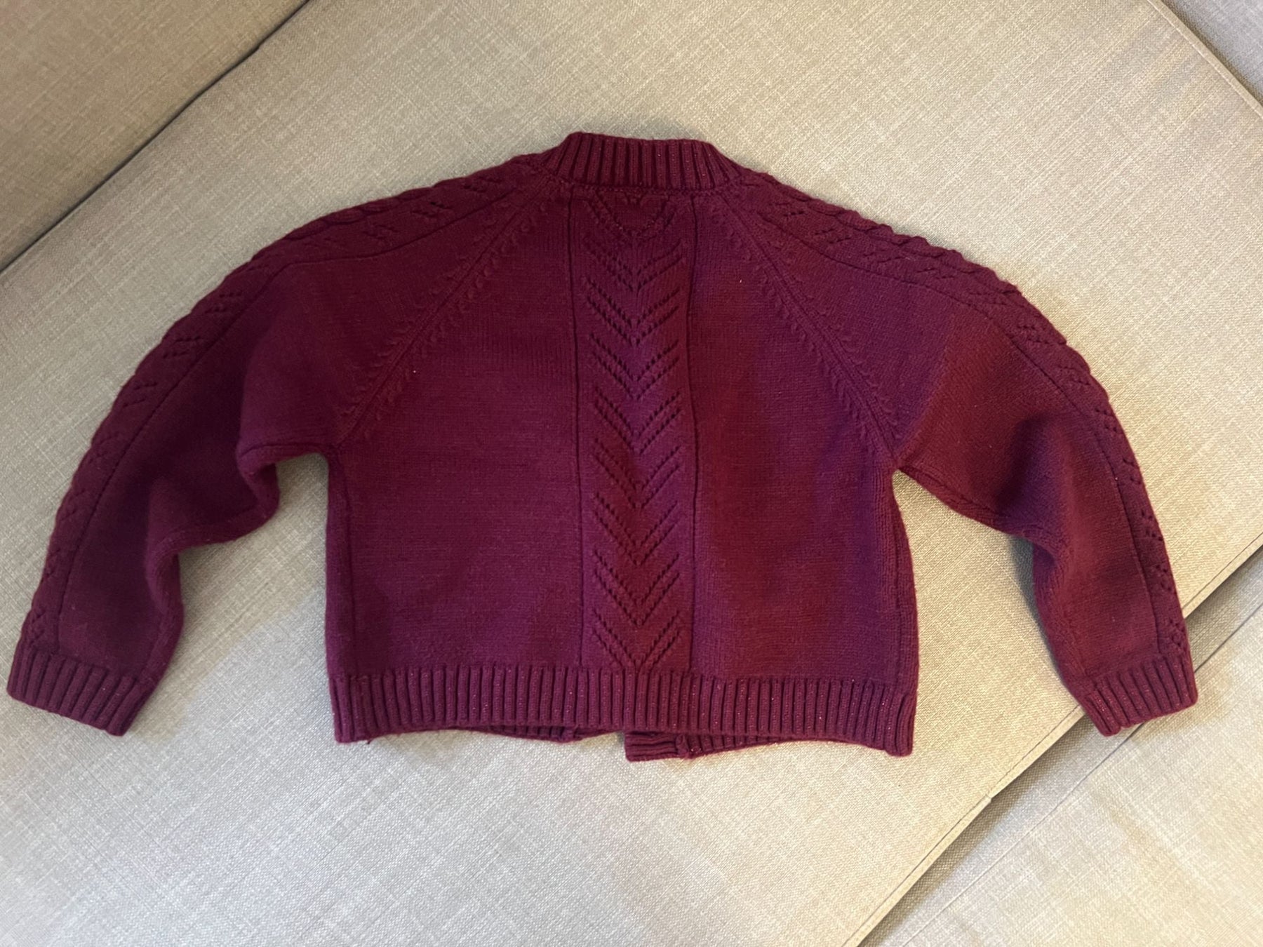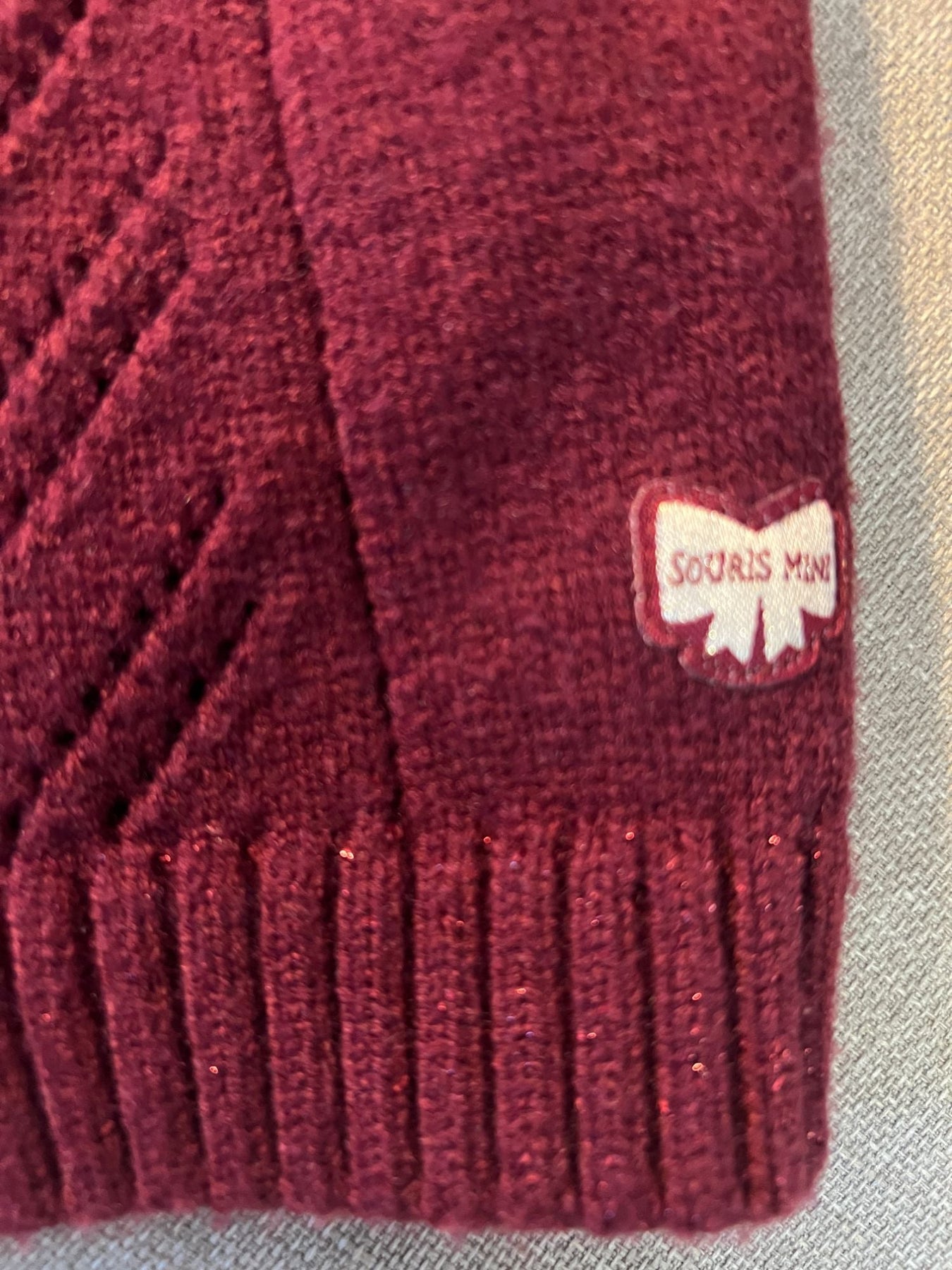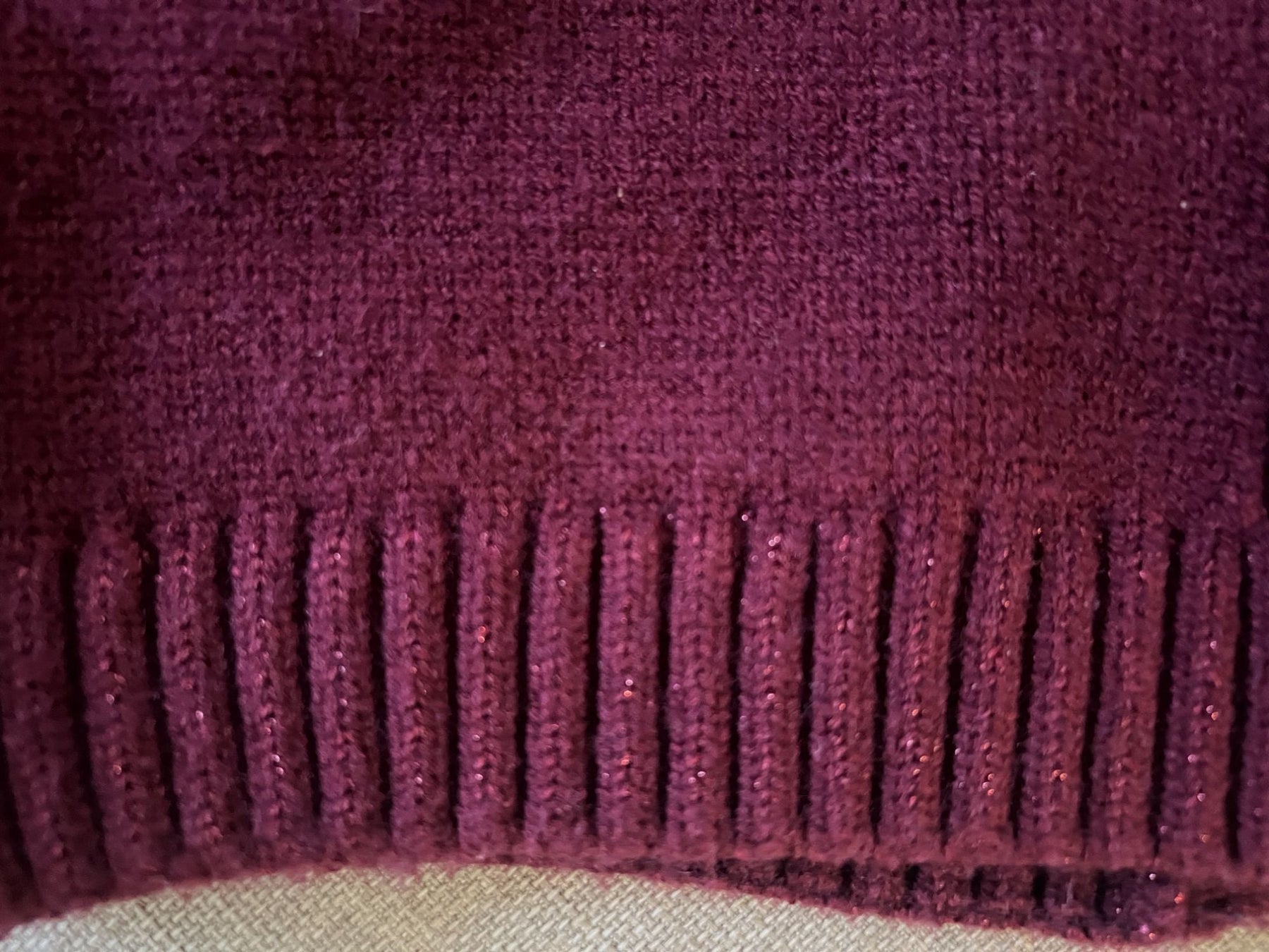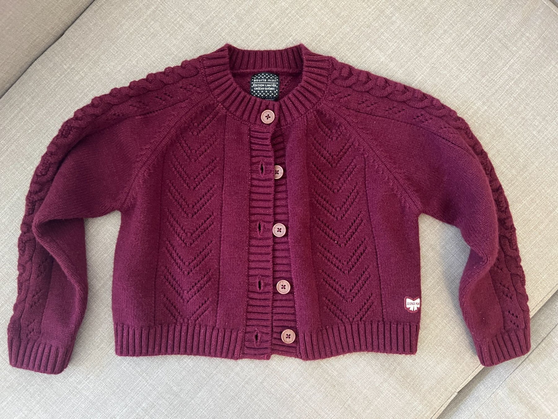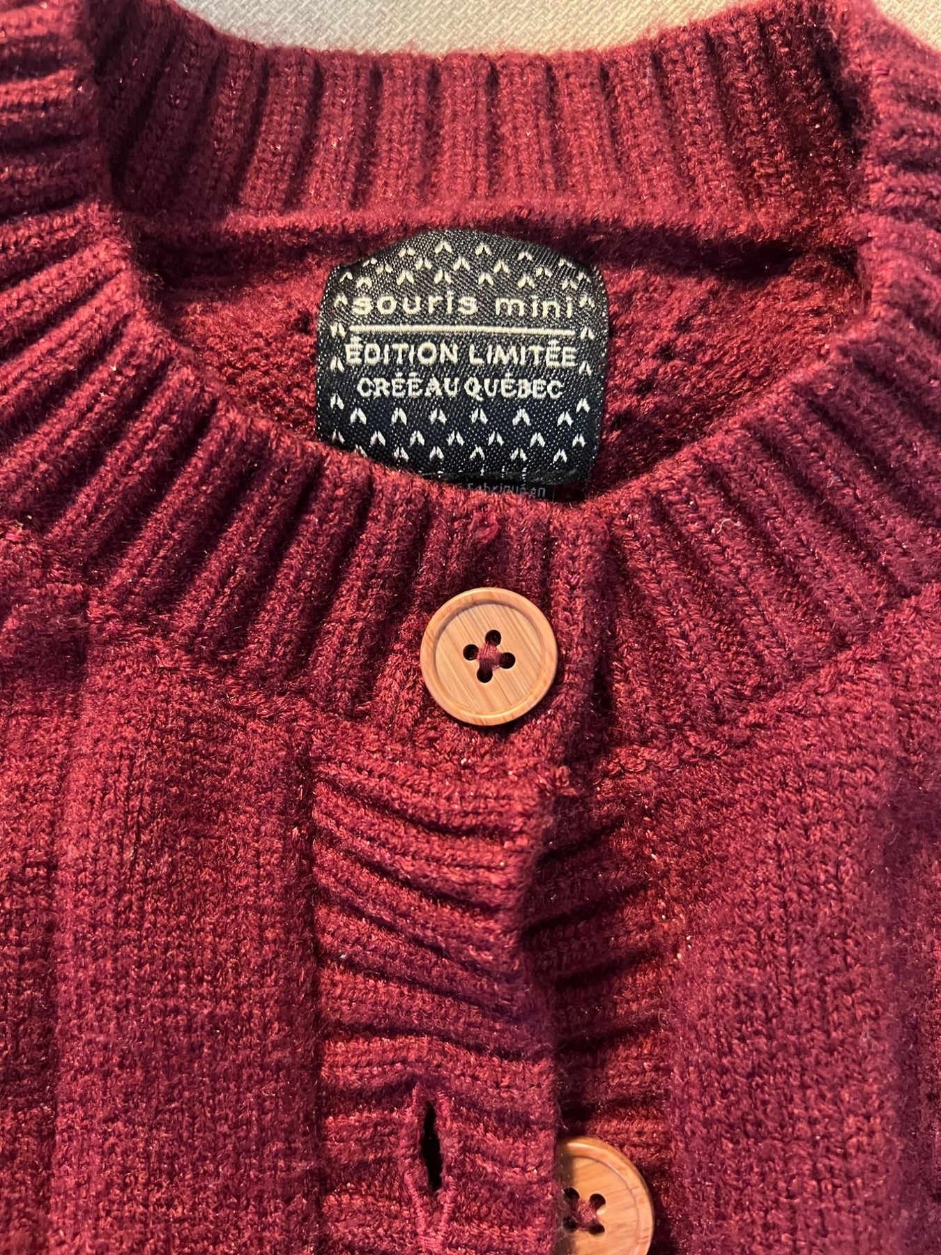 Magnifique tricot avec tissu qui brille, rouge vin, boutton en simili bois, édition limitée créée au Québec.