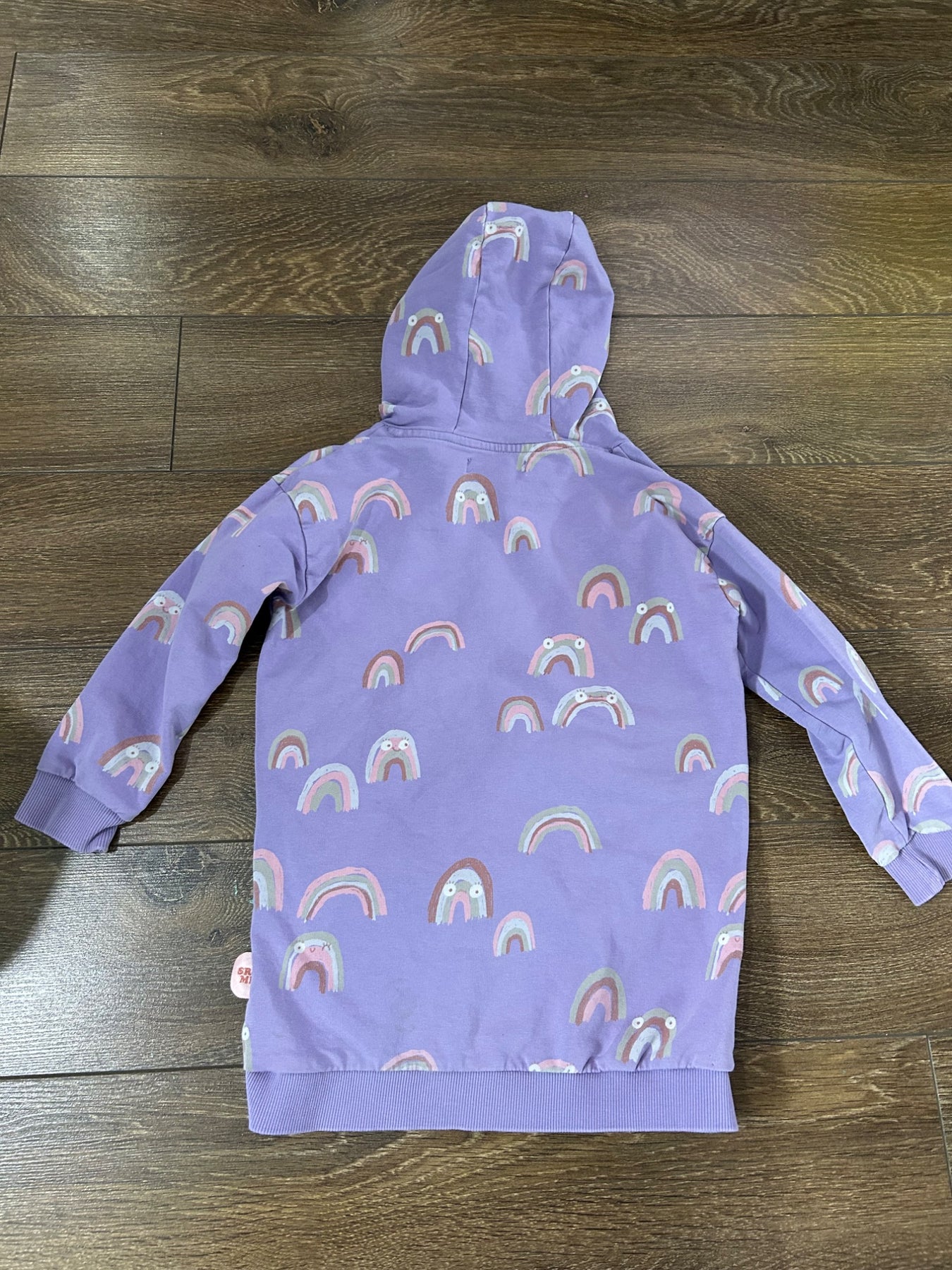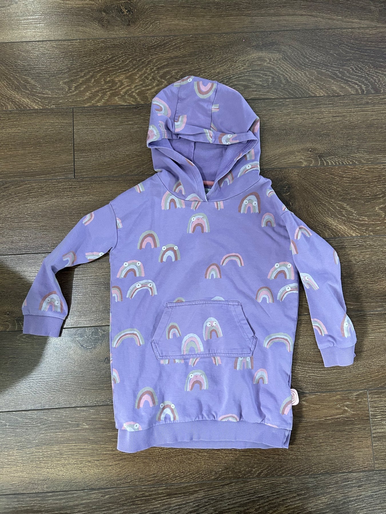 Tunique mauve avec capuchon et motif Arc-en-ciel 3 Ans. Fait longtemps en raison de la longueur (peut être portée de 3 ans à 4-5 ans pour un enfant de taille moyenne). Tissu d’excellente qualité. Comme neuve.
