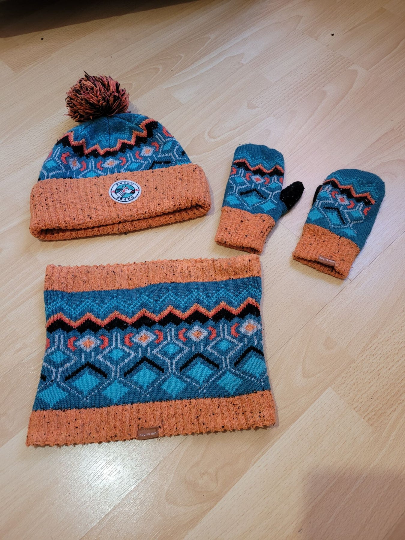 Tuque P/M, mitaines M et cache-cou TU. Cache-cou plus sec sur les bords. Maison sans fumée ni animaux.