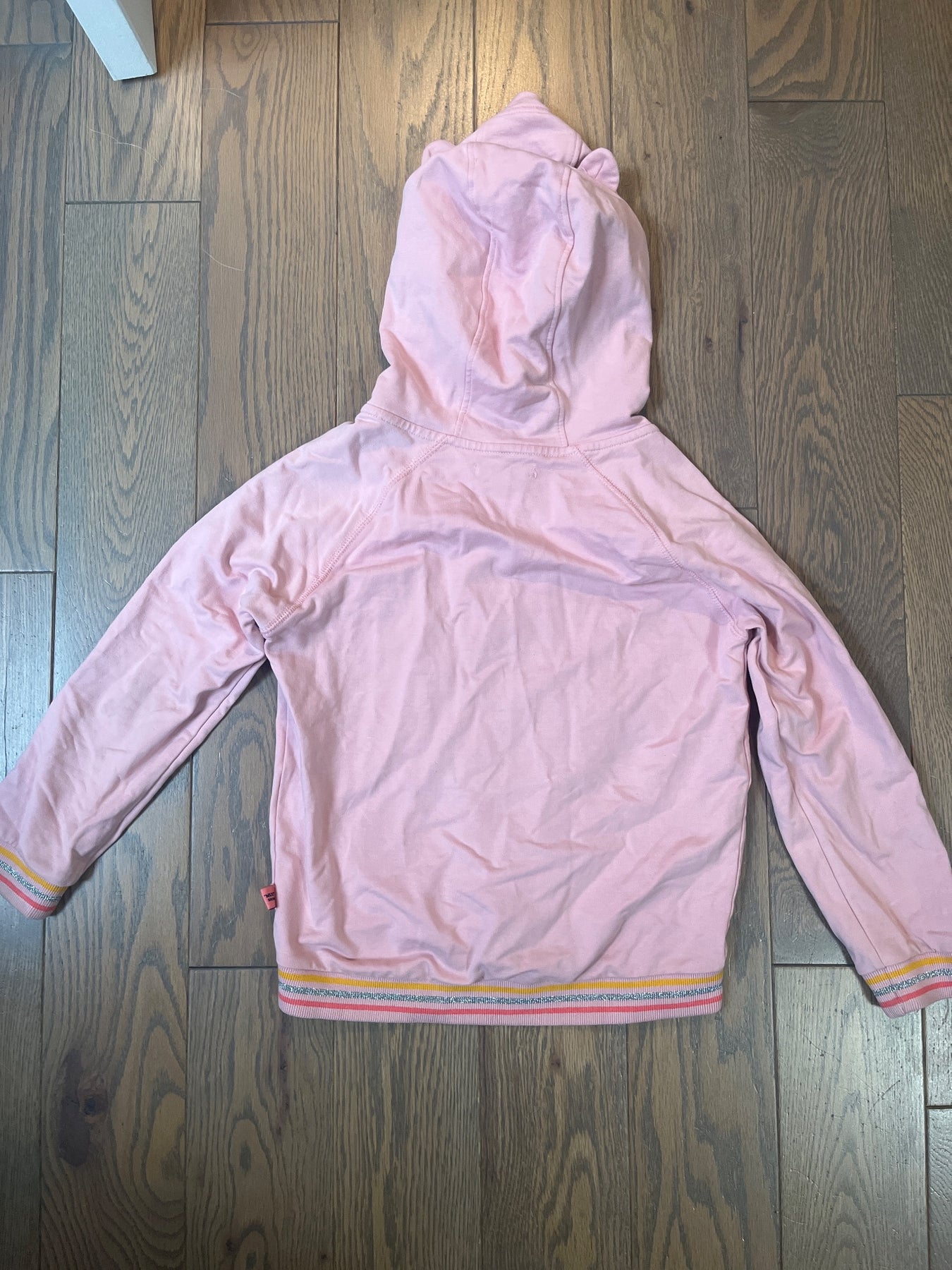 En bon état. Elle est faite grande je dirais 5-6 ans. Il y a des petits points sur la manche gauche.